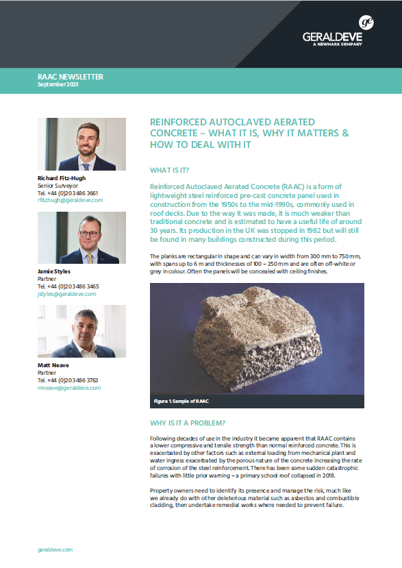 Following decades of use in the industry it became apparent that RAAC contains a lower compressive and tensile strength than normal reinforced concrete. This is exacerbated by other factors such as external loading from mechanical plant and water ingress exacerbated by the porous nature of the concrete increasing the rate of corrosion of the steel reinforcement. There has been some sudden catastrophic failures with little prior warning – a primary school roof collapsed in 2018. Property owners need to identify its presence and manage the risk, much like we already do with other deleterious material such as asbestos and combustible cladding, then undertake remedial works where needed to prevent failure.